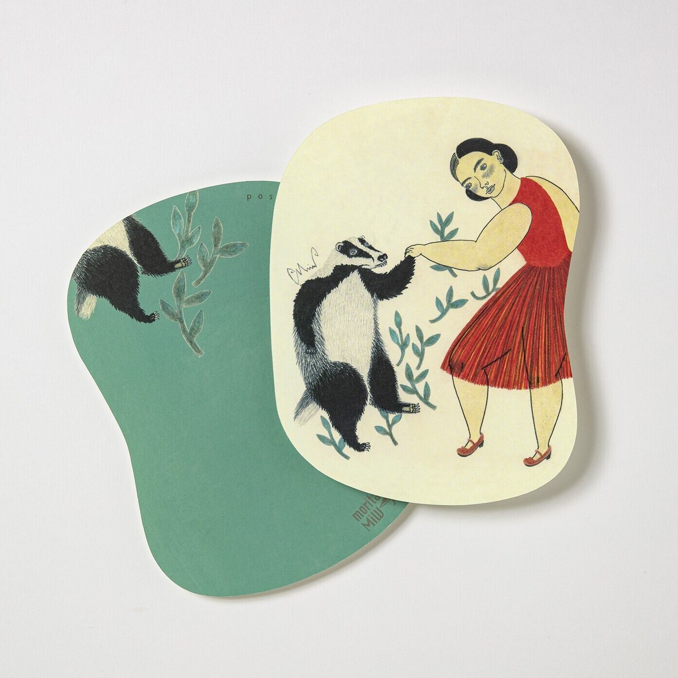 「moritaMiW]のオリジナル・ポストカードはちょっと大きめ、変型でクニュンとヘンテコな形です。見たことないようなMiWさんの不思議な世界が広がります。切手(定形外郵便になります)を貼って出してもいただけますが、表面、裏面ともに絵があるのでミニポスターとして飾っていただいても楽しいですよ。毎日がもっとおしゃれにハッピーに。