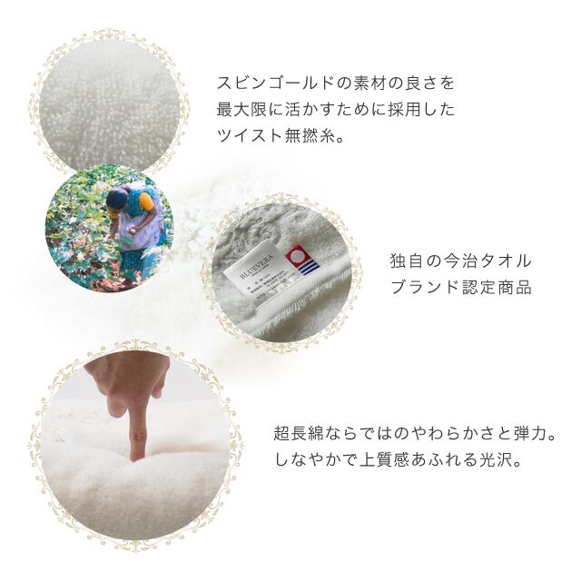 インド南部の、限られた農園でのみ栽培される名品、世界でも極上の糸といわれる「スビンゴールド」をたっぷり使った贅沢なタオルです。さらにその素材の持ち味を最大限に引き出す手法としてツイスト無撚糸を採用。超長綿ならではのやさしさと強さをあわせもち、ふんわりとボリュームのあるしなやかな肌ざわりのタオルに仕上がりました。ひとつ上のエレガンスをお楽しみください。